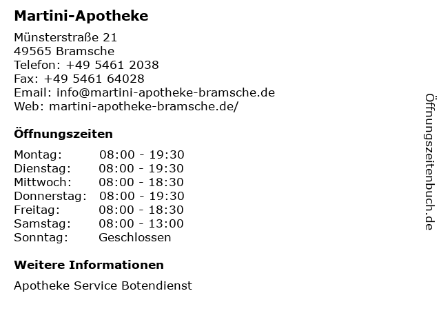 | Öffnungszeiten Martini-Apotheke in Bramsche anzeigen | |