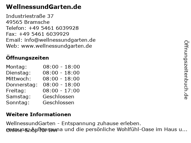 | Öffnungszeiten WellnessundGarten.de in Bramsche anzeigen | |