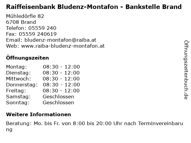 1 Raiffeisenbank Bludenz-Montafon - (Bankomat Bankstelle) (Entfernung: 0,00 km) Mühledörfle 82, 6708 Brand 2 Raiffeisenbank Bludenz-Montafon - (Bankomat Hauptbankstelle) (Entfernung: 7,86 km) Werdenbergerstraße 9, 6700 Bludenz 6 |
