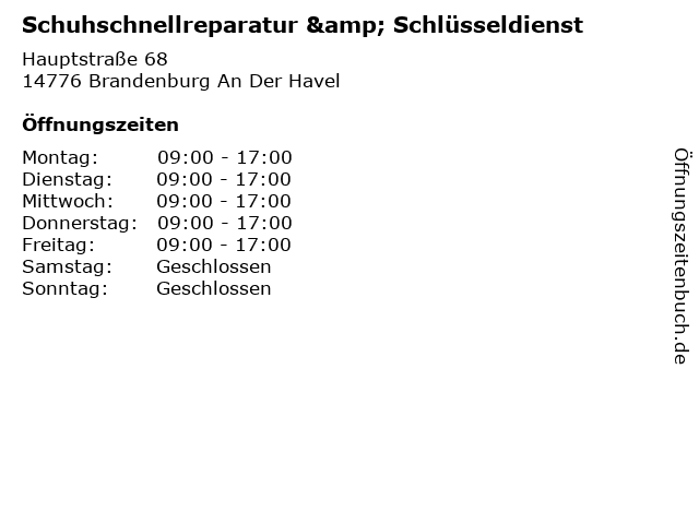 | Öffnungszeiten Schuhschnellreparatur & Schlüsseldienst in Brandenburg An Der Havel anzeigen | |
