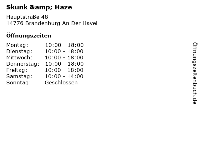 | Öffnungszeiten Skunk & Haze in Brandenburg An Der Havel anzeigen | |