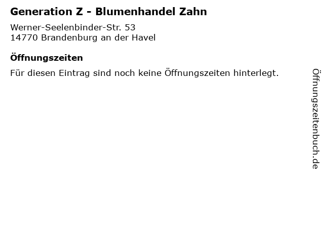 | Öffnungszeiten Generation Z - Blumenhandel Zahn in Brandenburg an der Havel anzeigen | |