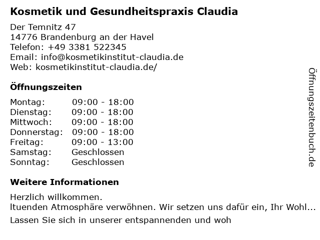 3 Praxis für Ergotherapie Claudia Werner Ergotherapie (Entfernung: 1,20 km) Rathenower Str. 7a, 14770 Brandenburg 4 Claudia Hantel & Steffi Bleichrodt - Praxis für Ergotherapie (Entfernung: 1,47 km) Hochstraße 29, 14770 Brandenburg an der Havel 6 |