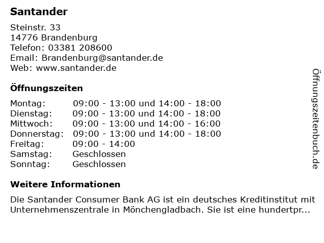 | Öffnungszeiten Santander in Brandenburg anzeigen | |