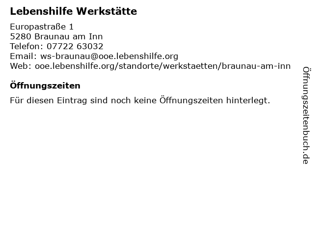 | Öffnungszeiten Lebenshilfe Werkstätte in Braunau am Inn anzeigen | |