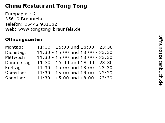 | Öffnungszeiten China Restaurant Tong Tong in Braunfels anzeigen | |