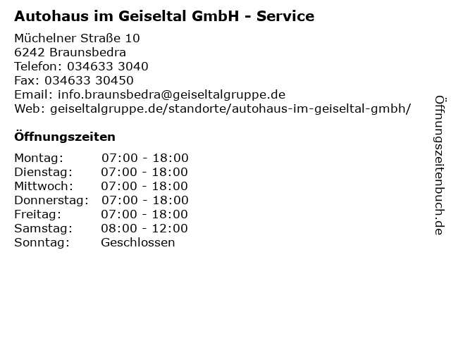 1 Autohaus im Geiseltal GmbH - Verkauf (Entfernung: 0,01 km) Müchelner Landstraße 10, 06242 Braunsbedra 6 Geiseltal Apotheke Inh. Clemens Frischkemuth (Entfernung: 1,00 km) Eduard-Dörge-Platz 8a, 06242 Braunsbedra |