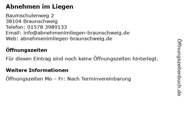 | Öffnungszeiten Abnehmen im Liegen in Braunschweig anzeigen | |