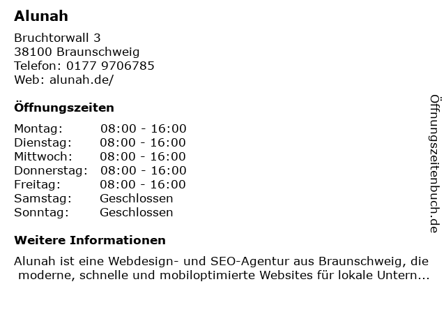 | Öffnungszeiten Alunah in Braunschweig anzeigen | |