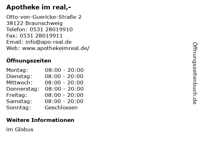 | Öffnungszeiten Apotheke im real,- in Braunschweig anzeigen | |