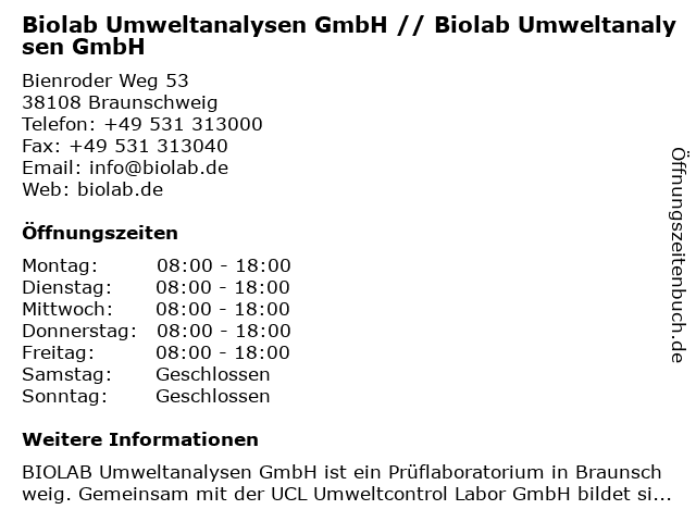 2 UCL Umwelt Control Labor GmbH // Standort Braunschweig (Entfernung: 0,00 km) Bienroder Weg 53, 38108 Braunschweig 4 Bund für Umwelt und Naturschutz Deutschland (Entfernung: 3,17 km) Schunterstr. 17, 38106 Braunschweig 6 Kogas GmbH Kompogas Umwelt- und Energietechnik (Entfernung: 3,61 km) Rheinaustraße 2a, 38112 Braunschweig |