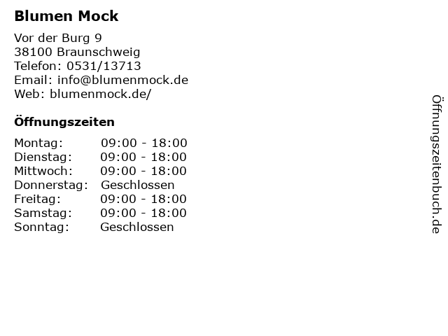 | Öffnungszeiten Blumen Mock in Braunschweig anzeigen | |
