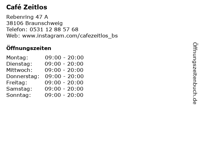 | Öffnungszeiten Café Zeitlos in Braunschweig anzeigen | |
