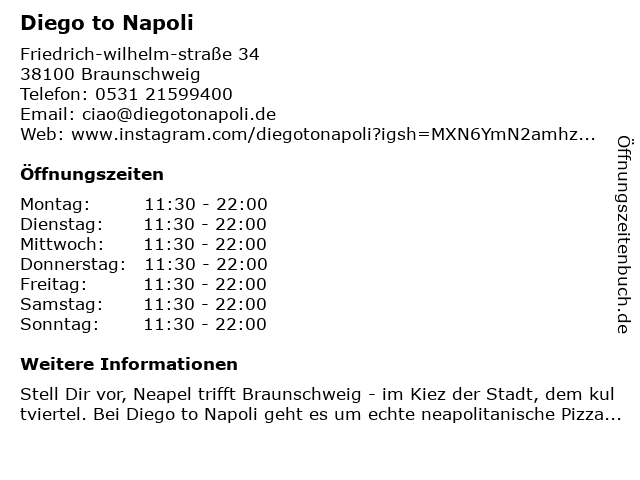 Öffnungszeiten Diego to Napoli in Braunschweig anzeigen | |