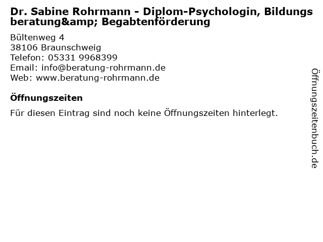 | Dr. Sabine Rohrmann - Diplom-Psychologin, Bildungsberatung& Begabtenförderung anrufen | |