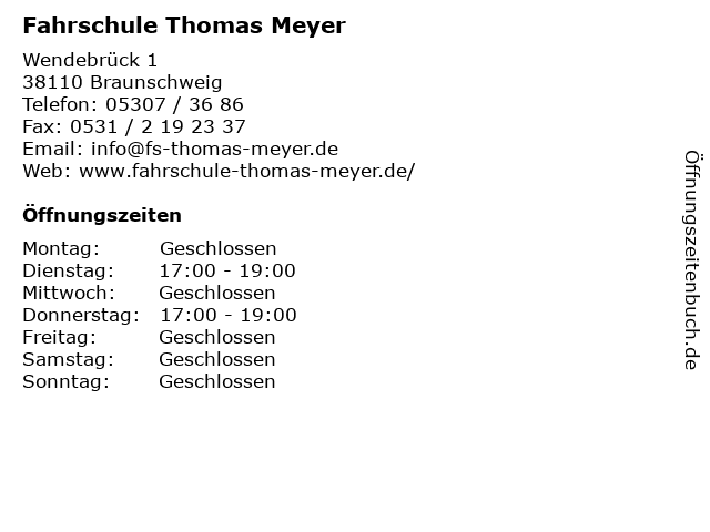 | Öffnungszeiten Fahrschule Thomas Meyer in Braunschweig anzeigen | |