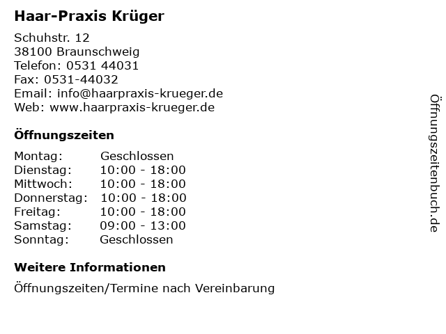 | Öffnungszeiten Haar-Praxis Krüger in Braunschweig anzeigen | |
