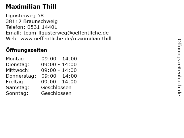 | Öffnungszeiten Maximilian Thill in Braunschweig anzeigen | |