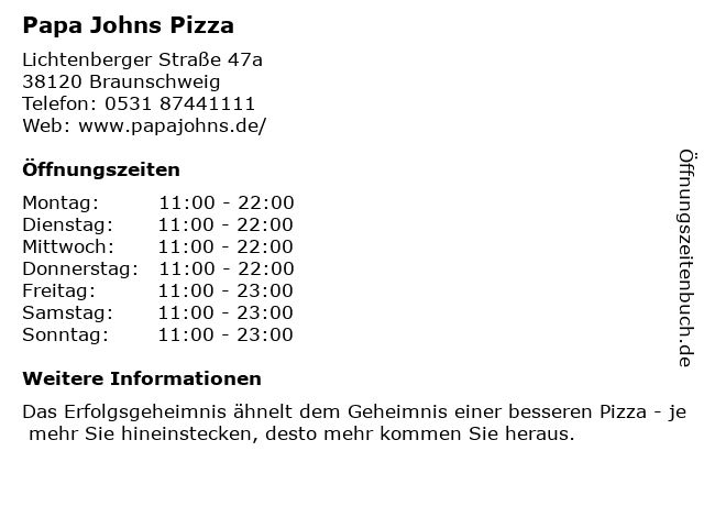 | Öffnungszeiten Papa Johns Pizza in Braunschweig anzeigen | |