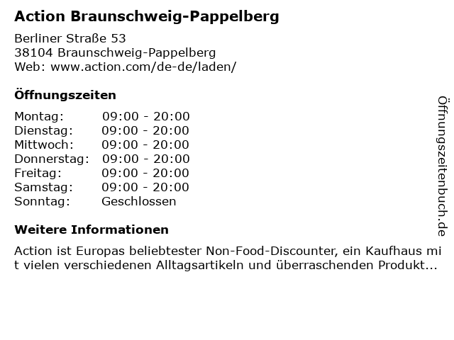 | Öffnungszeiten Action Braunschweig-Pappelberg in Braunschweig-Pappelberg anzeigen | |