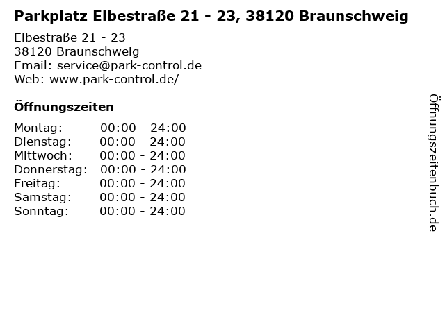 | Öffnungszeiten Parkplatz Elbestraße 21 - 23, 38120 Braunschweig in Braunschweig anzeigen | |
