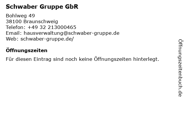 | Öffnungszeiten Schwaber Gruppe GbR in Braunschweig anzeigen | |