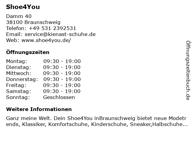 | Öffnungszeiten Shoe4You in Braunschweig anzeigen | |