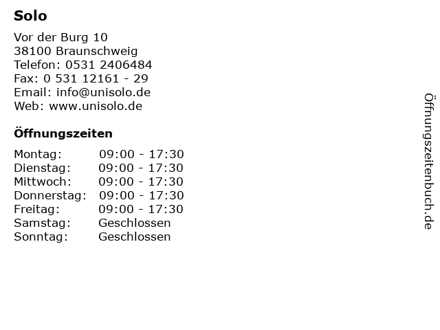 | Öffnungszeiten Solo in Braunschweig anzeigen | |