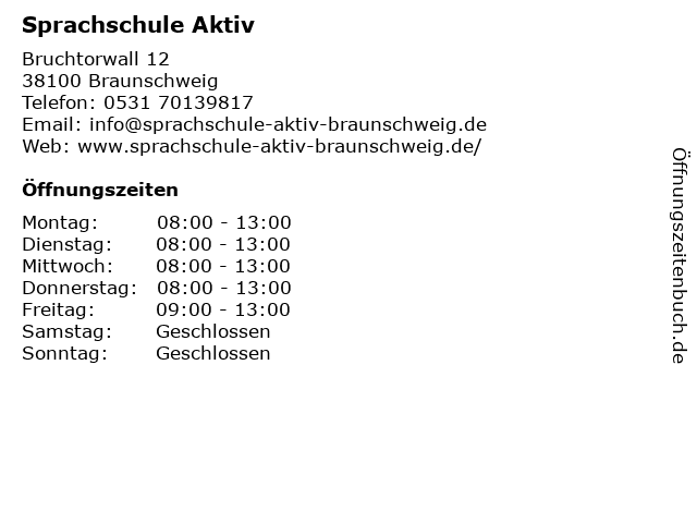 | Öffnungszeiten Sprachschule Aktiv in Braunschweig anzeigen | |