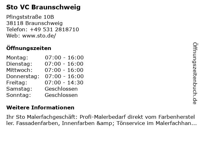 | Öffnungszeiten Sto VC Braunschweig in Braunschweig anzeigen | |
