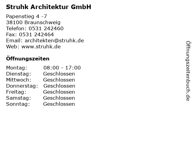 | Öffnungszeiten Struhk Architektur GmbH in Braunschweig anzeigen | |