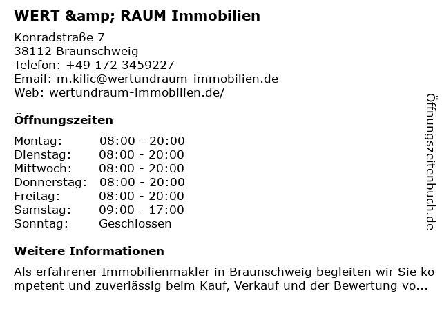 Öffnungszeiten WERT & RAUM Immobilien in Braunschweig anzeigen | |