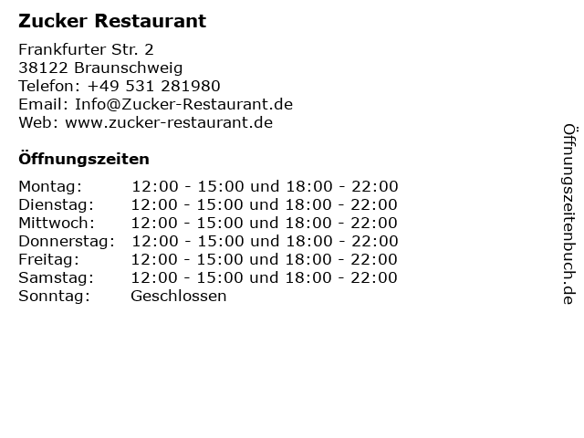 | Öffnungszeiten Zucker Restaurant in Braunschweig anzeigen | |
