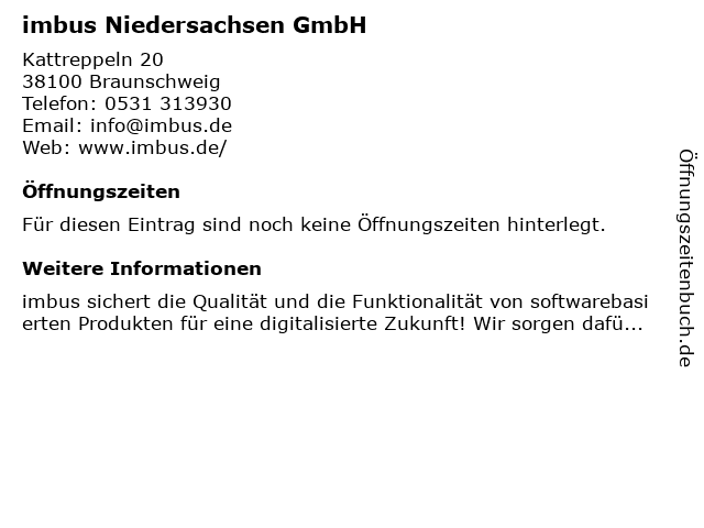| Öffnungszeiten imbus Niedersachsen GmbH in Braunschweig anzeigen | |