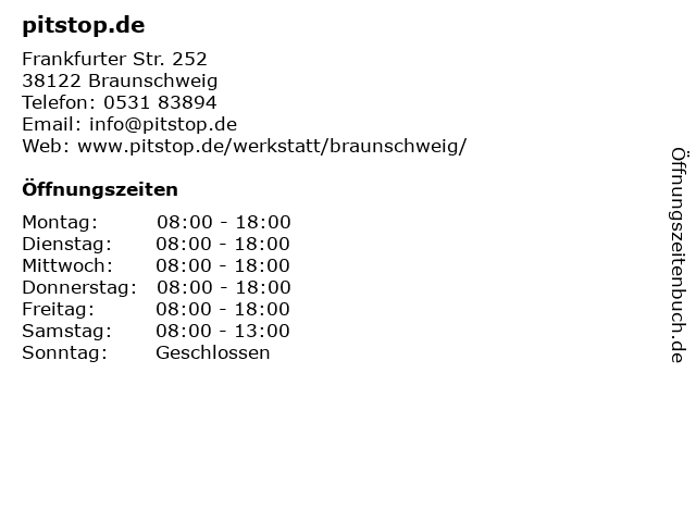 | Öffnungszeiten pitstop.de in Braunschweig anzeigen | |