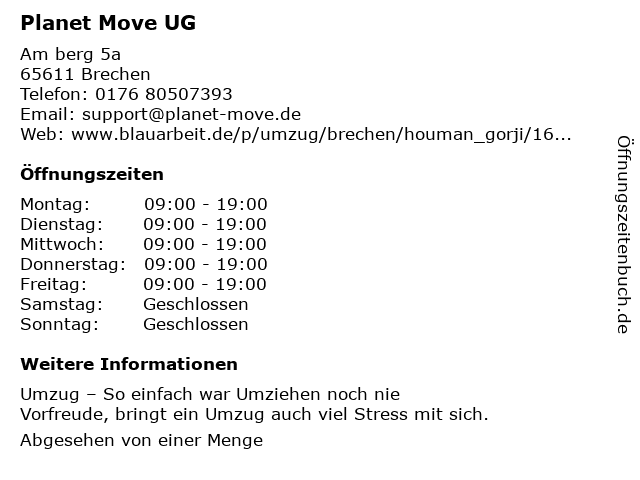 | Öffnungszeiten Planet Move UG in Brechen anzeigen | |