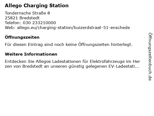 | Öffnungszeiten Allego Charging Station in Bredstedt anzeigen | |