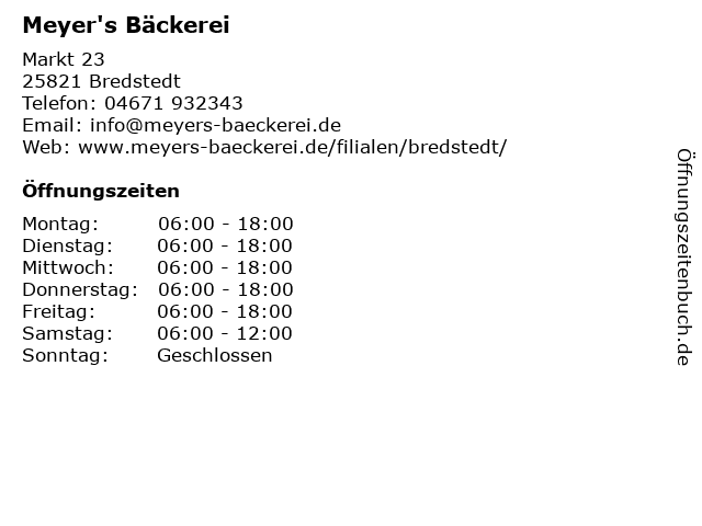 | Öffnungszeiten Meyer's Bäckerei in Bredstedt anzeigen | |