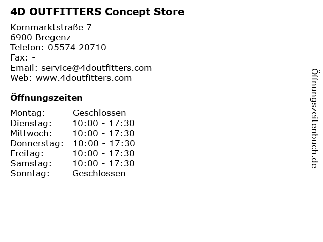 | Öffnungszeiten 4D OUTFITTERS Concept Store in Bregenz anzeigen | |