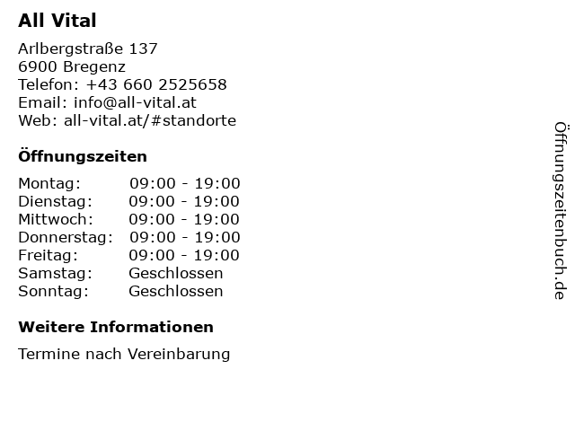 | Öffnungszeiten All Vital in Bregenz anzeigen | |