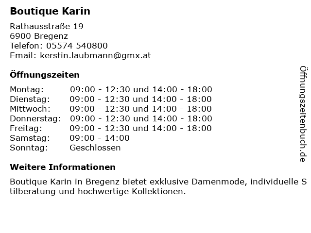 | Öffnungszeiten Boutique Karin in Bregenz anzeigen | |