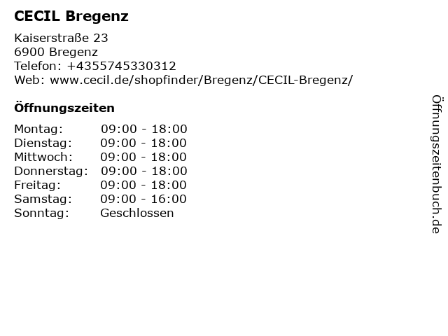 | Öffnungszeiten CECIL Bregenz in Bregenz anzeigen | |