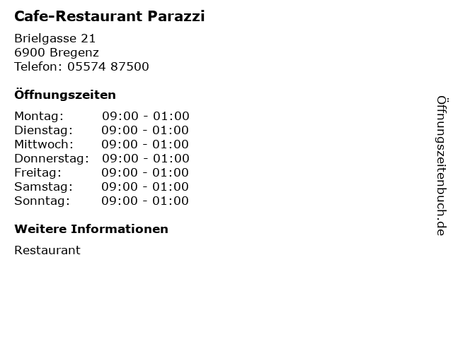 | Öffnungszeiten Cafe-Restaurant Parazzi in Bregenz anzeigen | |