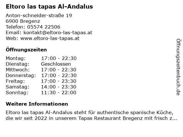 | Öffnungszeiten Eltoro las tapas Al-Andalus in Bregenz anzeigen | |