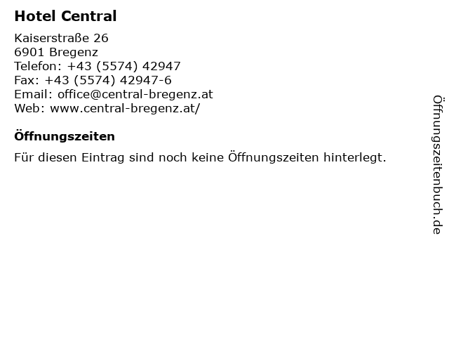 | Öffnungszeiten Hotel Central in Bregenz anzeigen | |