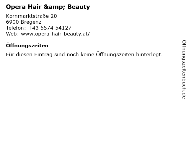 | Öffnungszeiten Opera Hair & Beauty in Bregenz anzeigen | |