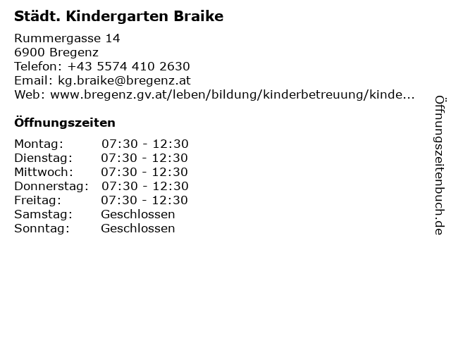 | Öffnungszeiten Städt. Kindergarten Braike in Bregenz anzeigen | |