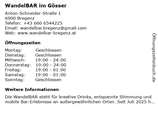 | Öffnungszeiten WandelBAR im Gösser in Bregenz anzeigen | |