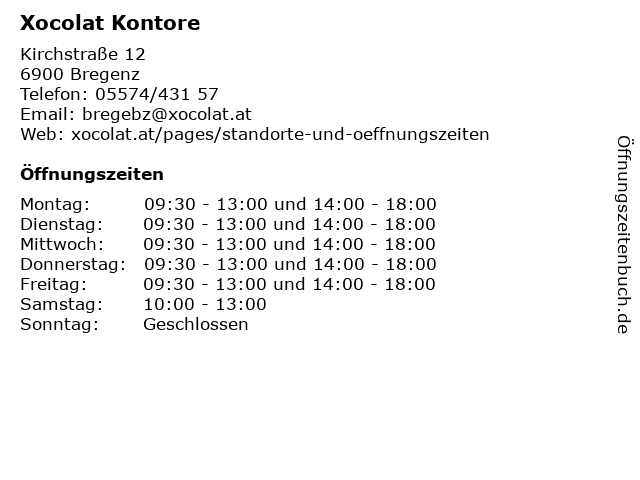 | Öffnungszeiten Xocolat Kontore in Bregenz anzeigen | |