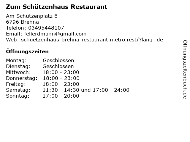| Öffnungszeiten Zum Schützenhaus Restaurant in Brehna anzeigen | |